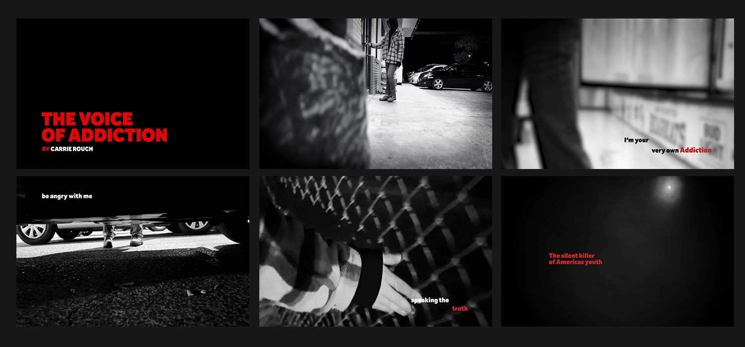"Courtney’s dedication to learn a new medium and navigate the numerous challenges live action video presents (such as staging shots, editing, sound, and animated typography) culminates in a story that is compelling and deeply personal. Hopefully Addiction provides a voice to those with similar experiences."
