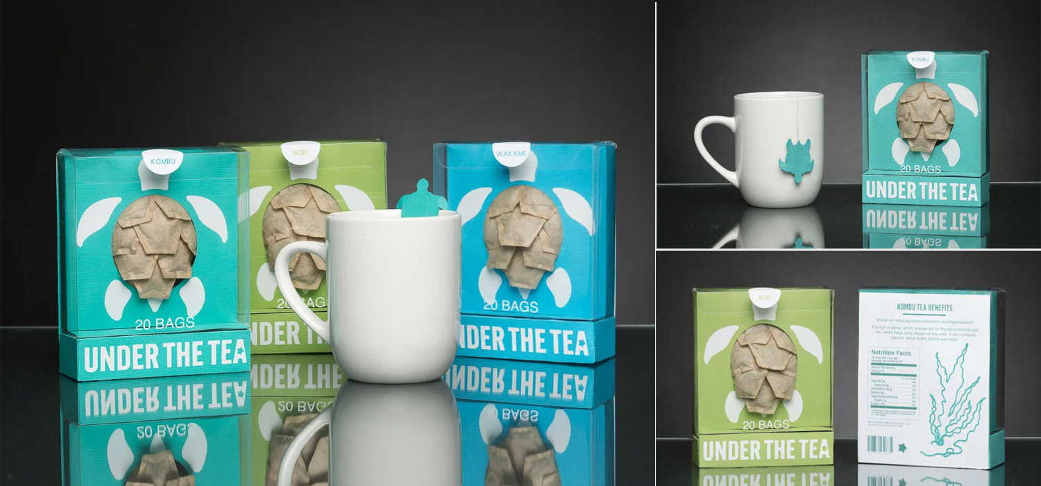"Kelsey’s Under the Tea packaging cleverly showcases the product by arranging the tea bags to bring dimensionality and texture to the sea turtle shell. Her attention to craft comes through in the execution of the packaging, however, I would consider an alternative to plastic packaging for the exterior in order to better support the concept of sustainability. Overall, nice job."