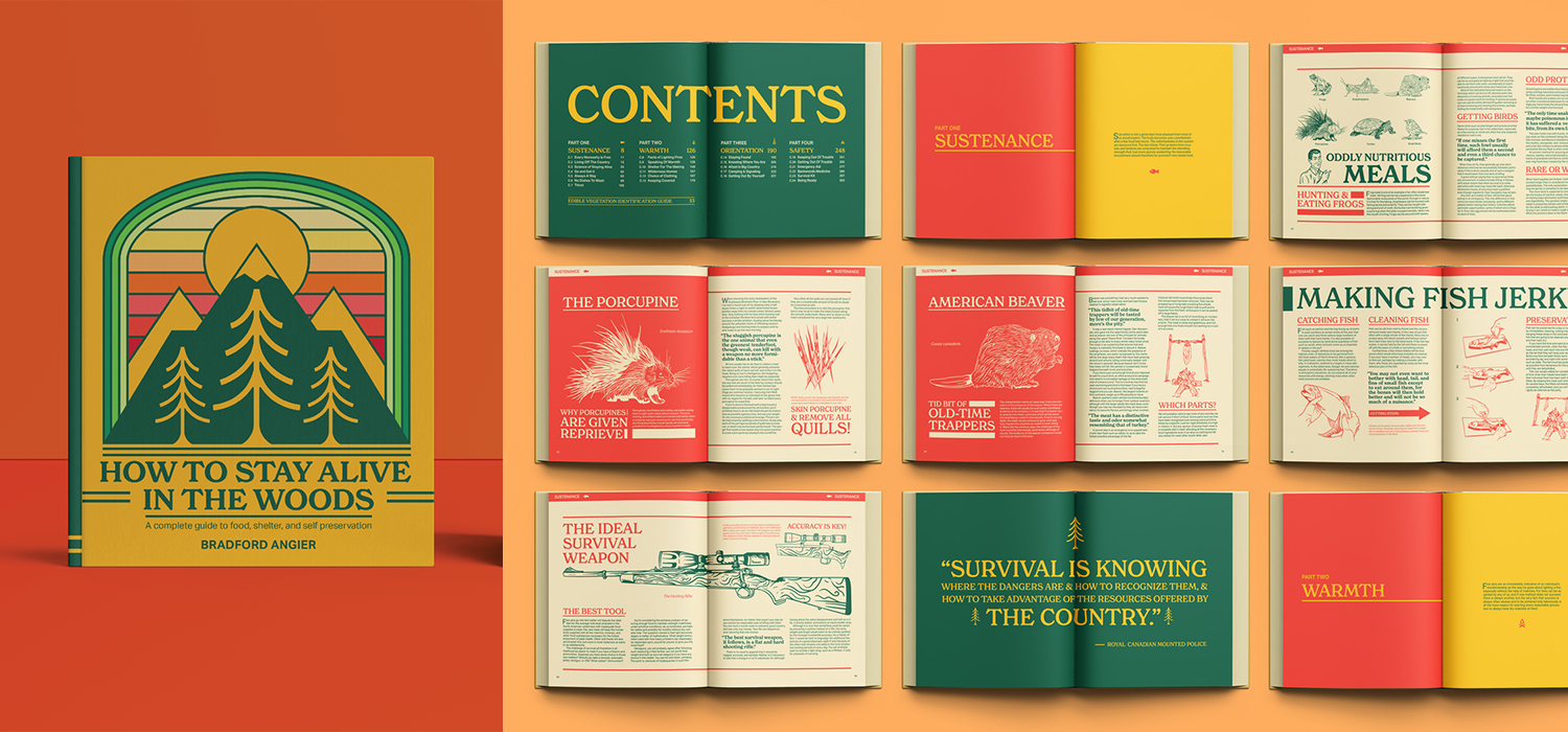 "Regan’s reimagining of How to Stay Alive in the Woods shows a strong sense of layout and type hierarchy. He successfully combines typography, color, and illustration to evoke a vintage scouting feel that pays homage to the original publication. The pacing of the layout allows the reader to digest information easily and gives the eye a break through the use of pared back divider spreads and expressive typography on individual pages. Well done."
